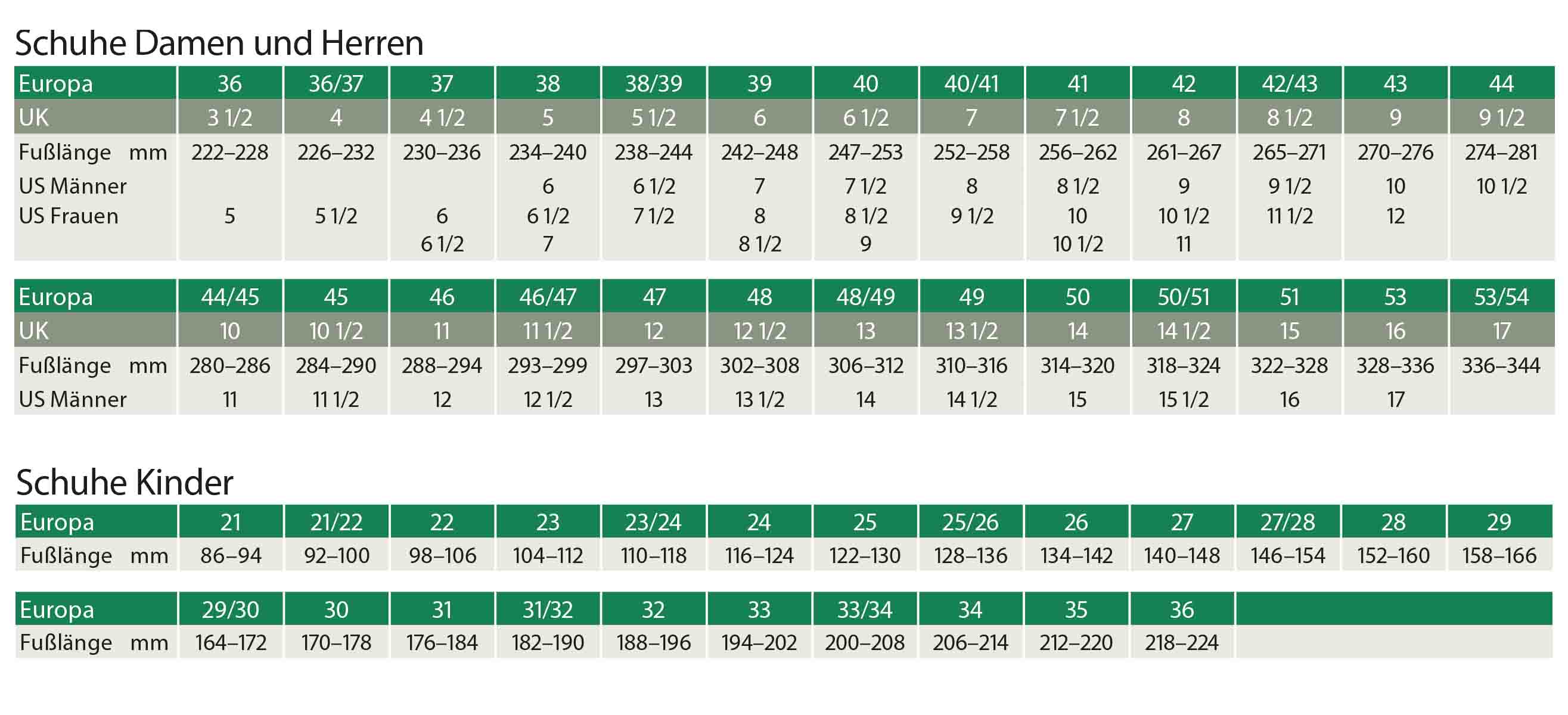 Orientieren Sie sich nach dem Messen ruhig an Ihrer normalen Schuhgröße. Generell gilt auch hier, dass die Schuhe der verschiedenen Hersteller unterschiedlich ausfallen können. Die entsprechenden Größentabellen finden Sie auch hier passend zum jeweiligen Artikel in unserem Shop. Der beste Weg, die richtige Größe Ihres neuen Lieblingsschuhs zu finden, ist aber nach wie vor: Anprobieren!