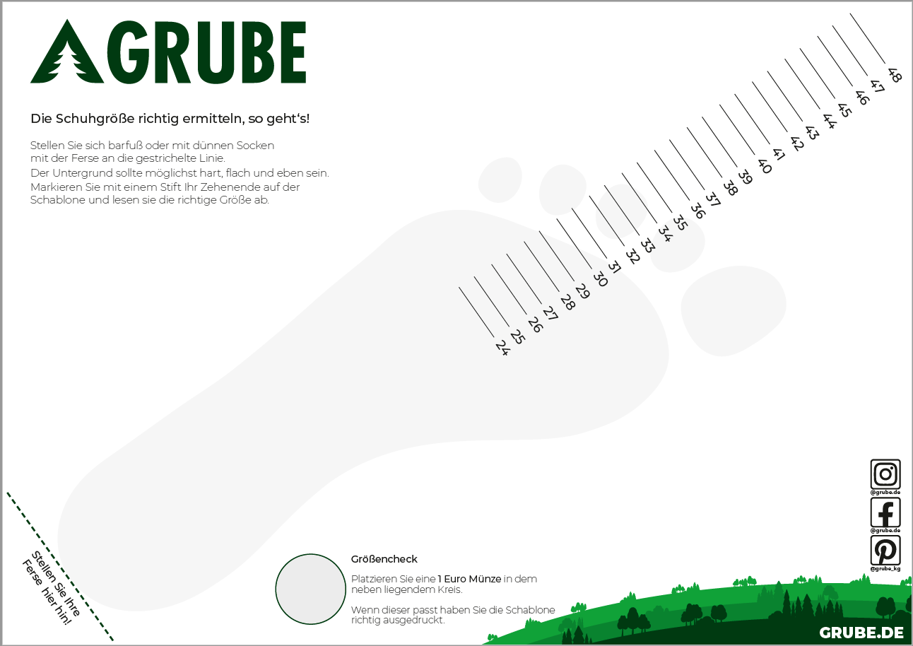 Um Ihnen die Bestimmung der richtigen Schuhgröße zu erleichtern, haben wir eine Schablone angefertigt. Diese können Sie einfach ausdrucken. Eine 1-€-Münze dient zur Kontrolle für das richtige Format. Achten Sie darauf, dass Sie die Schablone mit einer Skalierung von 100 % drucken. Mitunter ist eine andere Voreinstellung hinterlegt. Wenn der Ausdruck das richtige Format hat, können Sie anschließend einen Fuß auf die Schablone stellen und Ihre Schuhgröße ermitteln. Dafür stellen Sie sich barfuß oder mit dünnen Socken auf die ausgedruckte Schablone. Achten Sie darauf, dass der Untergrund möglichst hart, flach und eben ist. Ihre Ferse stellen Sie an die gestrichelte Linie. Mit einem Stift zeichnen Sie nun Ihr Zehenende auf der Schablone ein. Schon können Sie Ihre Schuhgröße in der EU-Größe ablesen. Für die UK-/US-Größen schauen sie in die nachfolgende Tabelle. Sollten Sie diese Schablone nicht ausdrucken können, empfehlen wir folgendes: Nehmen Sie sich ein Blatt Papier. Stellen Sie sich mit der Ferse am Papierrand auf das Blatt und markieren nun mit einem Stift das Ende Ihrer Zehen. Nehmen Sie sich dann ein Lineal, Maßband oder einen Zollstock und messen Sie vom Papierrand bis zu dieser Markierung. Lesen Sie nun die Zentimeter ab und rechnen Sie 1,5 bis 2 Zentimeter dazu. Das ist sozusagen die obligatorische Daumenbreite, die sicherlich noch vielen vom Schuhkauf früher bekannt sein dürfte. Diese Länge multiplizieren Sie dann mit 1,5 und schon haben Sie Ihre Schuhgröße.